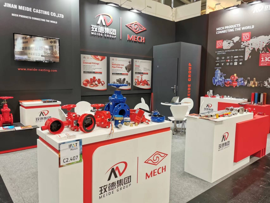 玫德集团展示了水务领域的拳头产品,包括玛钢管件、沟槽管件、阀门、不锈钢卡压管件、抗震支架、软管、水表等。丰富的产品展示吸引了来自不同国家客户的关注和询问,促成多单合作意向。玫德不仅是产品的生产者,更是标准的定制者,60多年来不仅品质得到业界好评,在服务上也一直精益求精,生产不同国家地域标准的产品,远销全球130多个国家。