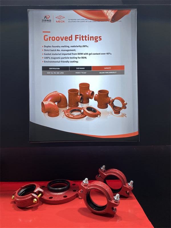 玫德集团有限公司沟槽管件年产量及销售额全国第一。双联工艺,球化率≥90%;批次号管理,质量可追溯;胶圈原料源自Dow,含胶量≥40%;螺栓100%磁粉探伤,表面涂层低铅环保。