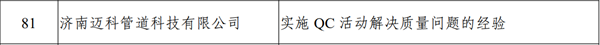近日,山东省工业和信息化厅公示了2024年全省质量标杆典型经验名单,经企业申报、有关部门推荐、专家论证等程序,济南迈科管道科技有限公司《实施 QC活动解决质量问题的经验》成功入选。