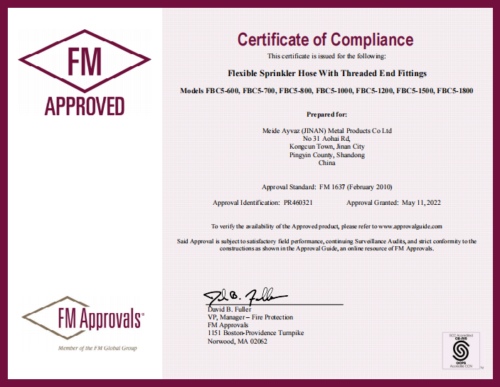 Meide FBC5 series flexible hose has obtained FM certificate!