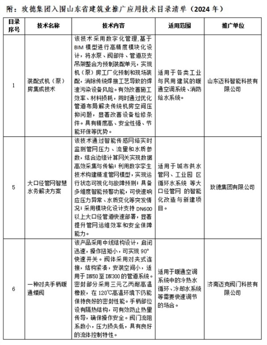近日,山东省住房和城乡建设厅发布了《山东省建筑业推广应用技术目录(2024年度)》, 玫德集团旗下玫德集团有限公司、济南迈克阀门科技有限公司、山东迈科智能科技有限公司各有1项成果入选;其中《大口径管网智慧水务解决方案》成为山东省住建厅重点选取的有引领性、示范性和产业带动作用的标志性成果之一。此次征集聚焦居住品质提升、绿色低碳等重点领域,涵盖新技术、新材料、新工艺、新产品,全省共遴选出36项成果。