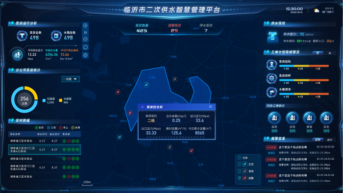 平台看板集中展示水厂与泵房位置及运行状态,实时监控压力、流量、水质等20余项指标,支持按区域、时间、设备类型多维度查询,各运行参数一目了然,直观显示设备异常位置与状态,及时发现问题并解决。