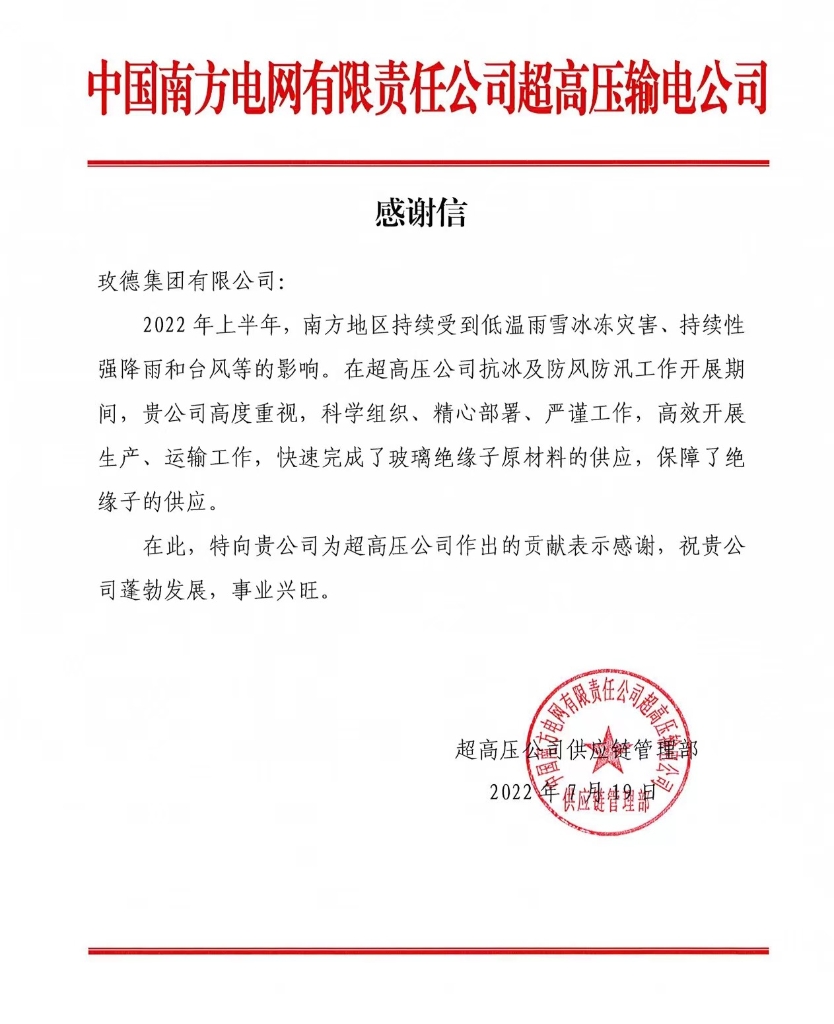 近日,中国南方电网有限责任公司向玫德集团发来感谢信,感谢玫德在今年上半年极端天气的情况下,接到抗冰防汛项目的紧急订单,高度重视、高效供货,3天内完成项目订单的交付工作,超出南方电网领导的预期,助力合作伙伴顺利施工。