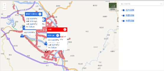 SCADA系统的管网监控数据基于地图为底图呈现,压力、流量、水质等数据实时监控,各项监控数据可根据需要灵活的分层、分级、分专题进行图形化显现,通过一张图的形式将客户关心的数据进行动态化展示,真正让客户做到管理可视化、运营高效化。
