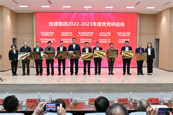 供应商颁奖环节,由玫德集团董事局主席孔令磊、玫德庚辰金属材料有限公司总裁于瑞水、济南迈克阀门科技有限公司总裁赵桂芝、济南科德智能科技有限公司总裁刘少云、玫德雅昌(济南)管业有限公司总裁田洪莲、山东晨晖电子科技有限公司总裁曲延河为玫德集团“卓越供应商”以及“优秀供应商”颁奖,夯实了供应商与玫德集团的合作,促使玫德集团提供更加优质的产品、解决方案以及服务。