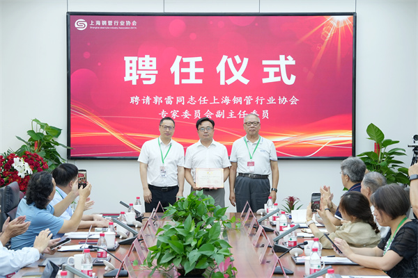聘请郭雷同志任上海钢管行业协会专家委员会副主任委员,上海钢管行业协会专家委员会主任孙永喜、上海钢管行业协会物装委员会主任林光辉共同为玫德集团董事局副主席、迈科管业董事长郭雷颁发上海钢管行业协会专家委副主任证书。