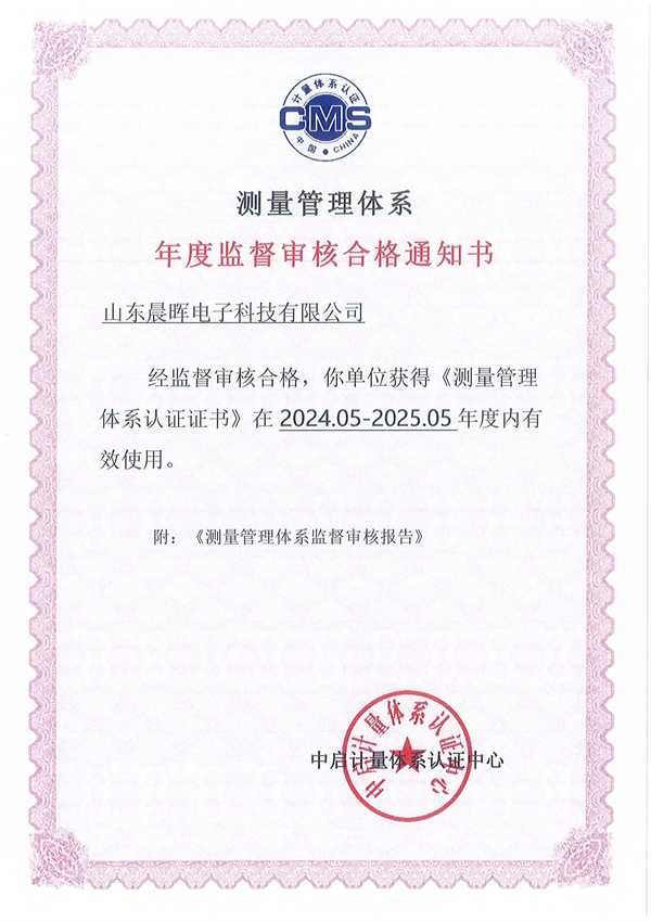 本次审核由权威机构组织进行,涵盖了山东晨晖电子科技有限公司在测量管理体系方面的各项标准及实施情况。经过严格的审查和评估,山东晨晖电子科技有限公司的测量管理体系顺利通过年度监督审核。