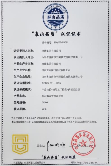 5月8日,山东省市场监督管理局正式发布2024年度“泰山品质”认证企业名单,玫德集团凭借卓越的产品质量、技术创新能力和行业领先地位,获得济南市市场监督管理局推选,成功通过严苛评审,荣获这一代表山东省最高质量水平的权威认证,成为济南2家获此殊荣的企业之一。此次获评,不仅是对玫德集团长期坚守品质初心的肯定,更彰显了其作为全球流体输送领域领军企业的综合实力。