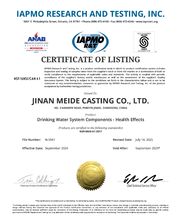 Meide Group's socket gate valves, flange gate valves, and fire hydrants (dry + wet) have obtained NSF61 certification。