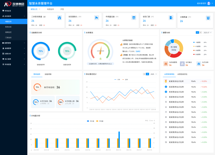 平台自动采集并动态更新泵房数量、设备总量、服务用户等基础数据,实时计算设备在线率、水质合格率、能耗效率等关键运营指标。一键生成日/月/年运行分析报告,支持设备能效排名与对标。